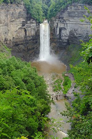 A lush summer flow of the massive waterfall just north of Ithaca, New York, which flows into Cayuga Lake.